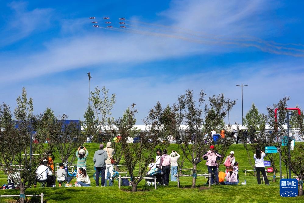 9月20日,参观者在长春市蓝天公园内观赏飞行表演。新华社记者 许畅 摄