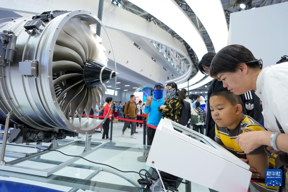 9月20日,参观者在现场观看涡扇发动机相关介绍。新华社记者 许畅 摄