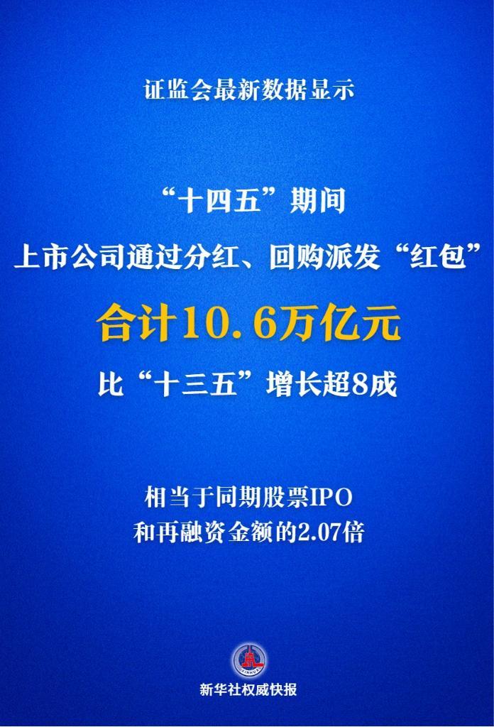 中国证监会主席吴清9月22日在国新办举行的“高质量完成‘十四五’规划”系列主题新闻发布会上介绍,上市公司主动回报投资者的意识明显增强,这5年上市公司通过分红、回购派发“红包”合计10.6万亿元,比“十三五”增长超8成,相当于同期股票IPO和再融资金额的2.07倍。