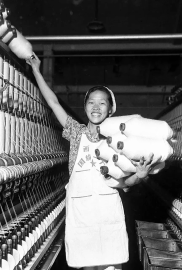 在细纱车间,万锭飞转,银线如流,看见女工轻盈地走在弄档里,赵梦桃心生羡慕,但最叫她眼热的还是老师傅戴着的红围腰,中间缀着“郝建秀工作者”。