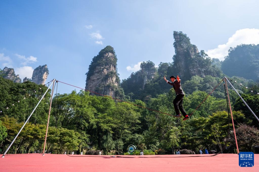 10月11日,来自俄罗斯的演员在张家界国家森林公园进行软钢丝杂技表演。新华社记者 陈思汗 摄