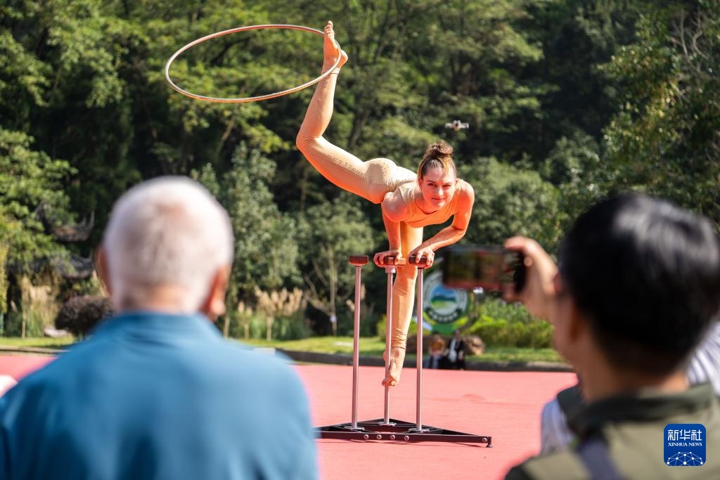 10月11日,来自德国的演员在张家界国家森林公园表演杂技《手平衡呼啦圈》。新华社记者 陈思汗 摄