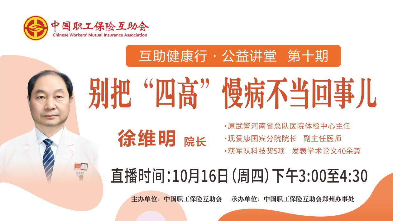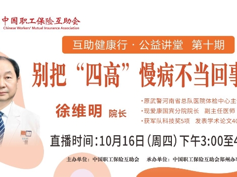 直播回顾|“互助健康行·公益讲堂”2025年第十期——别把“四高”慢病不当回事儿 10月16日(周四)下午3:00至4:30,由中国职工保险互助会主办、中互会郑州办事处承办的2025年第十期“互助健康行•公益讲堂”——《别把“四高”慢病不当回事儿》,开启线上直播。本期“互助健康行•公益讲堂”线上直播活动邀请原武警河南省总队医院体检中心主任,现爱康国宾体检医院分院长、副主任医师徐维明,和职工会员们聊一聊高血压、高血脂、高血糖、高尿酸“四高”慢病的全面管理。中工网首页、微博、抖音号同步播出。