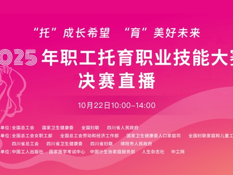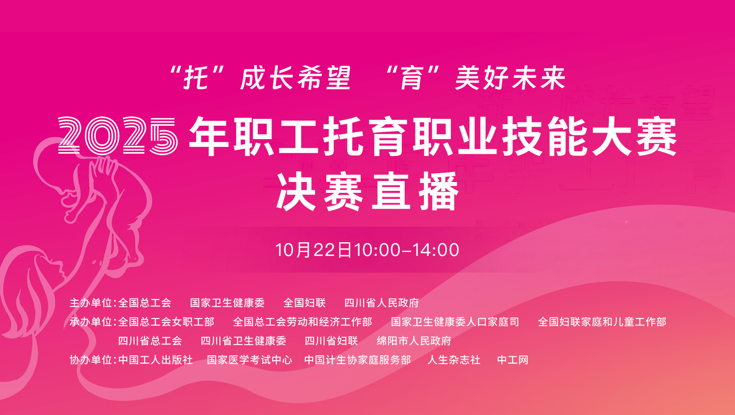 直播回顾|2025年职工托育职业技能大赛决赛 2025年职工托育职业技能大赛决赛于10月21日至24日在四川省绵阳市中国科技城会议展览中心举行。本次大赛由全国总工会、国家卫生健康委、全国妇联、四川省人民政府共同主办,旨在加强托育服务人才队伍建设,推动普惠托育服务体系发展。大赛以“‘托’成长希望‘育’美好未来”为主题,设置“婴幼儿发展引导员”与“保育师”两个工种。全国各省(区、市)及新疆生产建设兵团32支代表队参赛。10月22日10:00,中工网首页、微博、视频号同步播出。