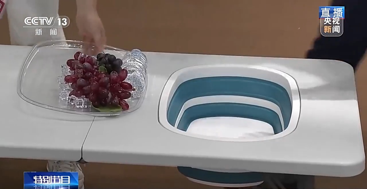 再看这张折叠桌,它的设计也很巧妙。桌面专门挖空了一块,可以嵌入一个篮子,冰镇饮料水果,简直就是为户外露营爱好者量身打造的。不用的时候,盖上盖板,不浪费桌面面积。