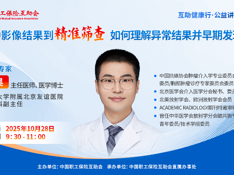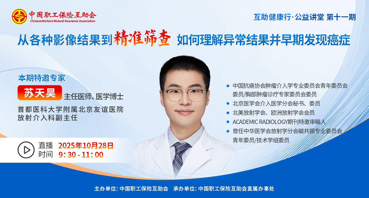 直播回顾|从各种影像结果到精准筛查:如何理解异常结果并早期发现癌症 亲爱的职工朋友们,您是否关注过肿瘤筛查?面对“各种影像检查”的报告,您是否有所困惑? 影像检查和肿瘤精准筛查息息相关,读懂影像检查报告是肿瘤筛查中的重要一环。为帮助大家探讨体检中的影像学检查如何帮助我们识别潜在风险,并通过进一步评估实现早期预防与干预,中国职工保险互助会特主办2025年第九期“互助健康行·公益讲堂----《从各种影像结果到精准筛查》”,开启线上直播。本期活动由中国职工保险互助会直属办事处承办,特别邀请影像介入领域权威专家,带您深入探讨“如何理解异常结果并早期发现癌症”,从专业角度解读指南、分析利弊,为您提供基于影像学检查的个体化防癌筛查,助您做出明智的健康选择!10月28日9:30,中工网首页、微博、视频号同步播出。