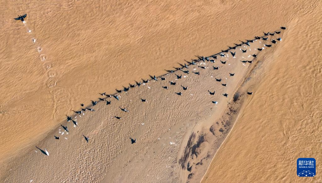 11月4日,在位于宁夏灵武市境内的黄河,候鸟在河滩上驻足栖息(无人机照片)。新华社记者 杨植森 摄