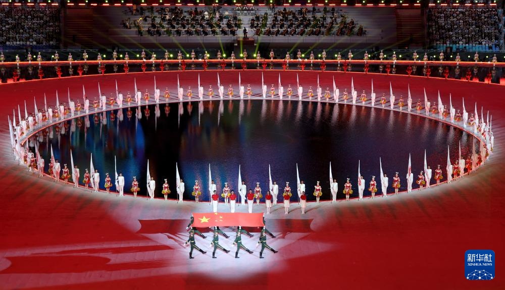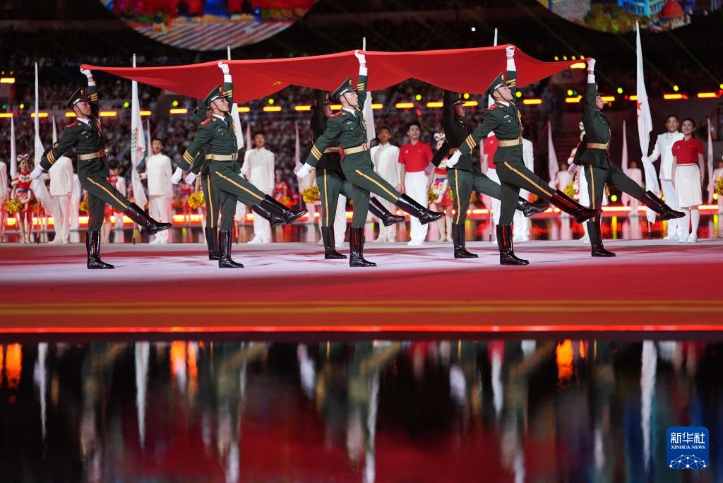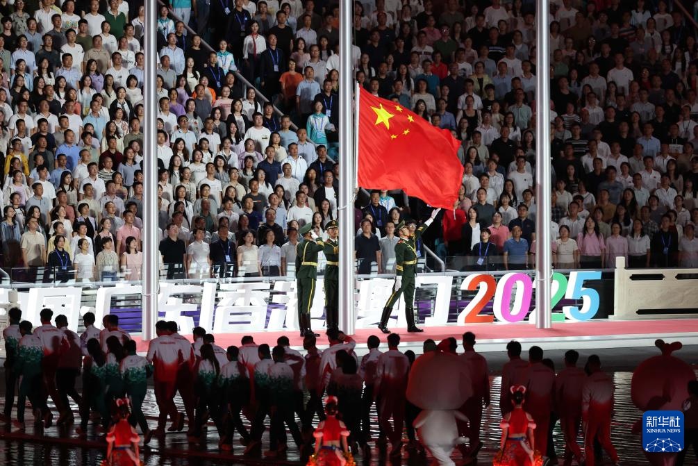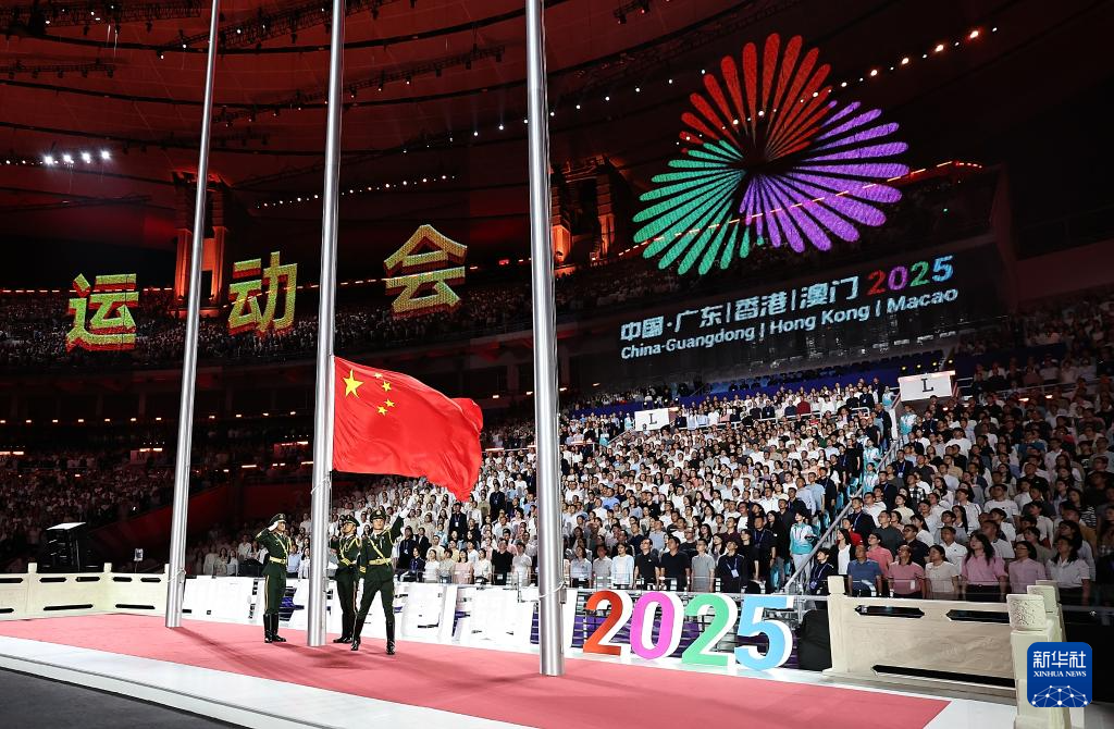 11月9日,中华人民共和国国旗、中华人民共和国运动会会旗和第十五届全国运动会会旗在开幕式现场升起。新华社记者 张龙 摄
