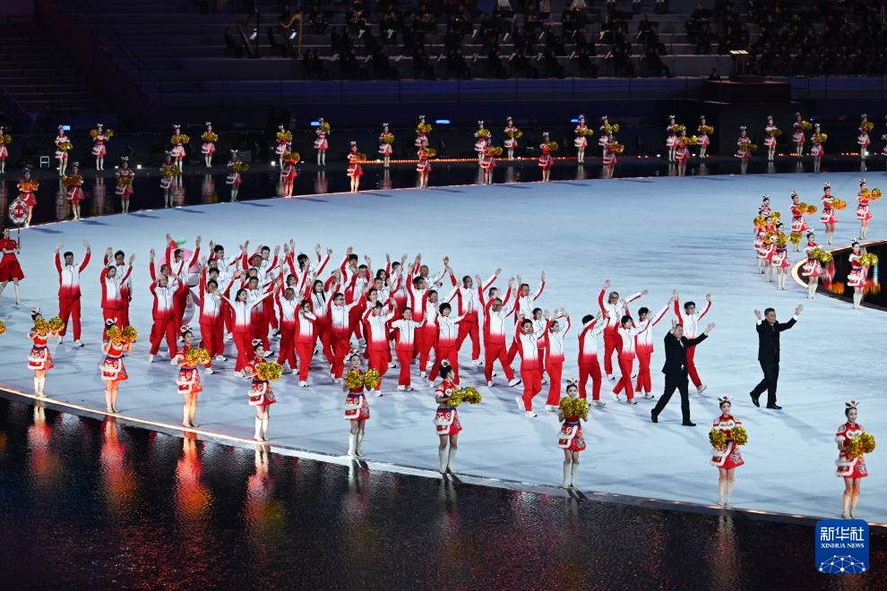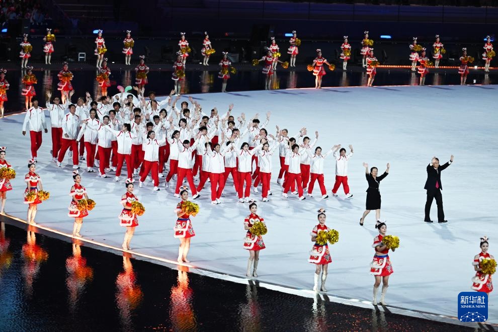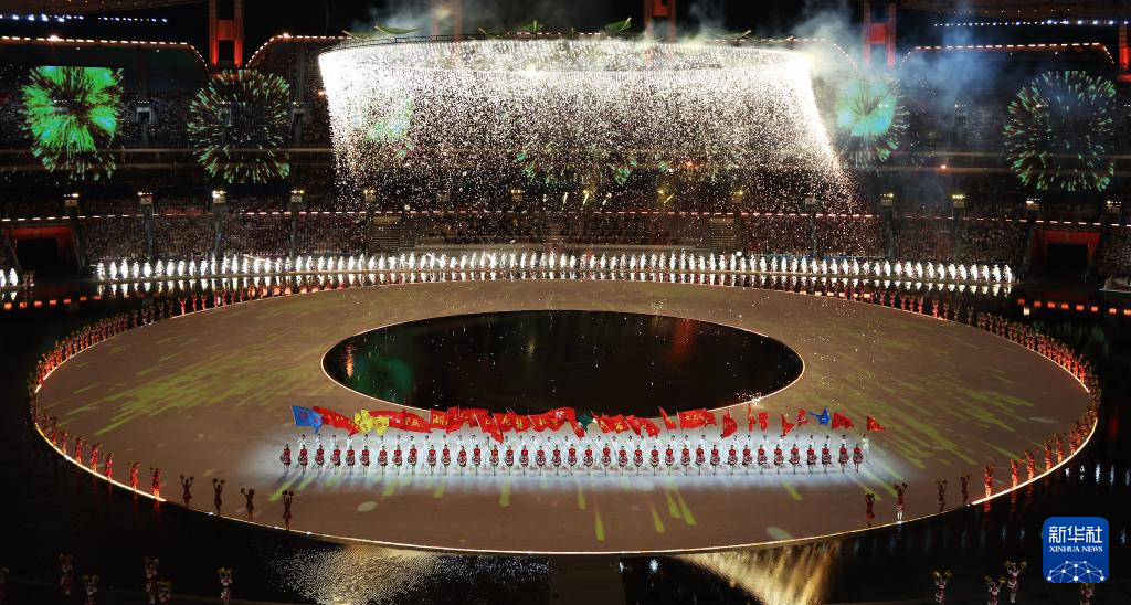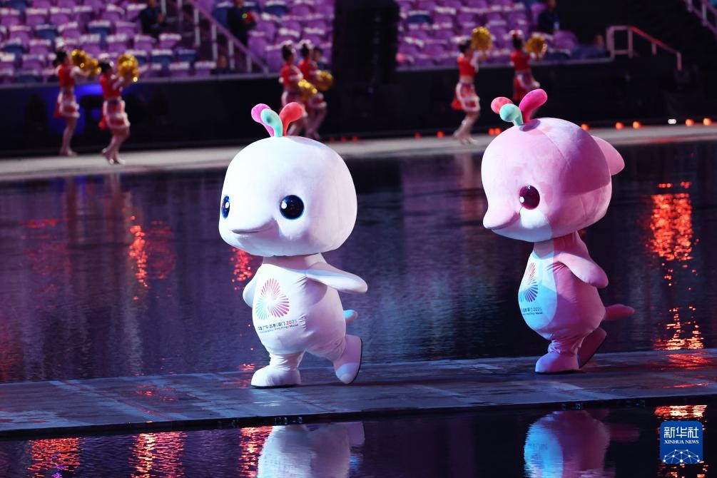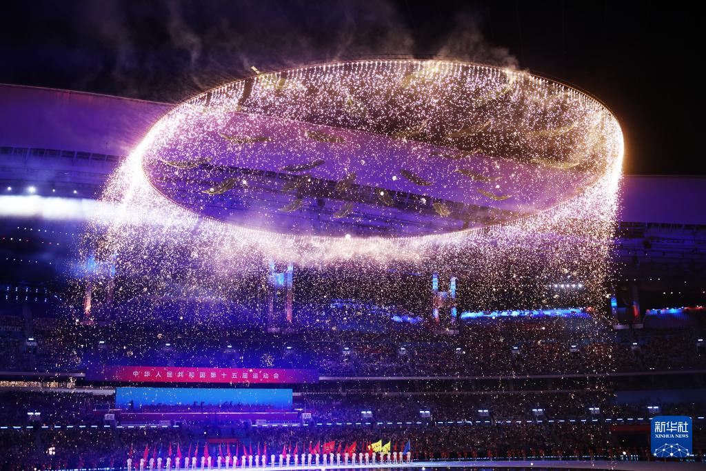 11月9日,第十五届全国运动会吉祥物“喜洋洋”和“乐融融”在开幕式现场表演。新华社记者 雒圆 摄