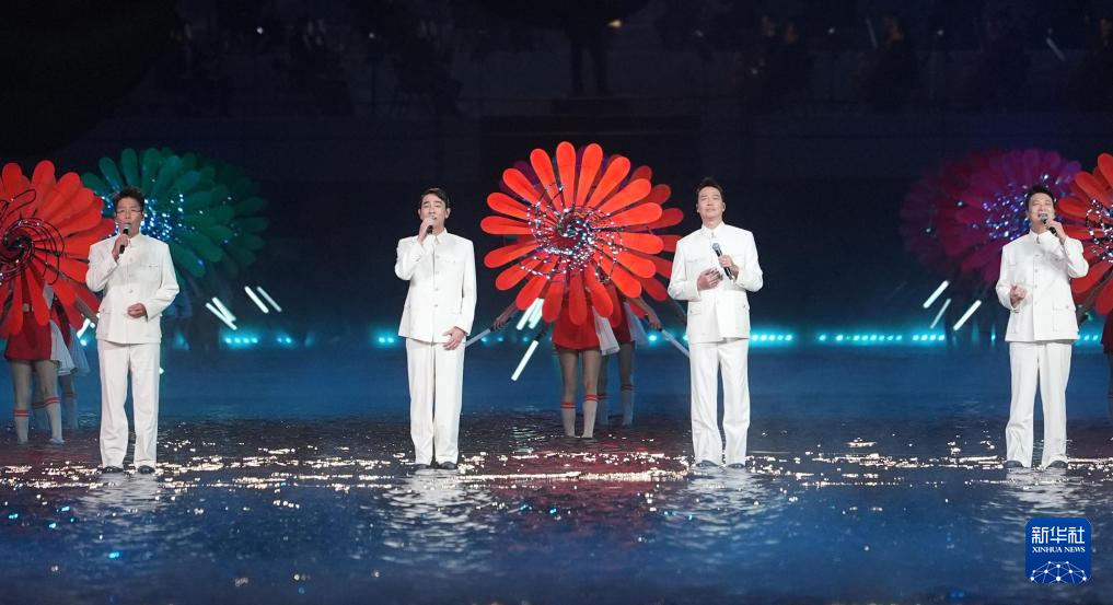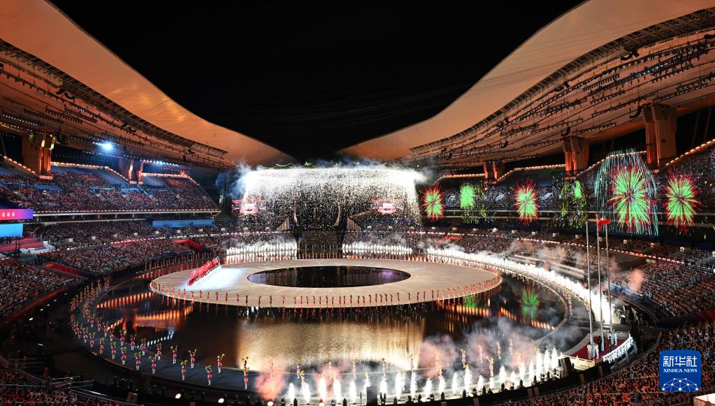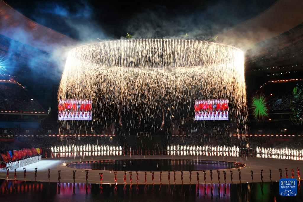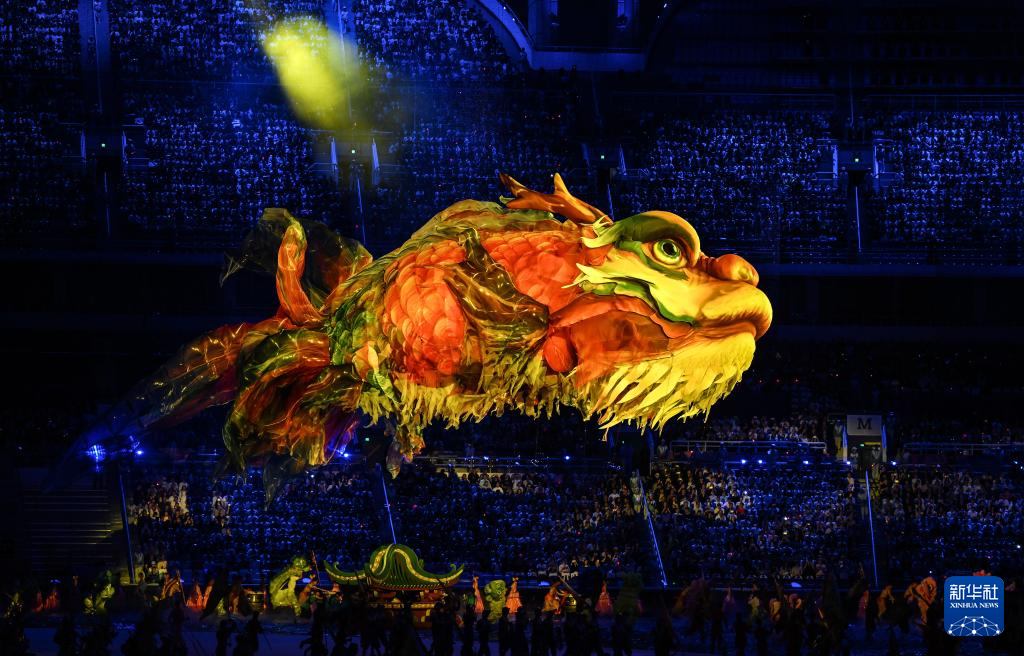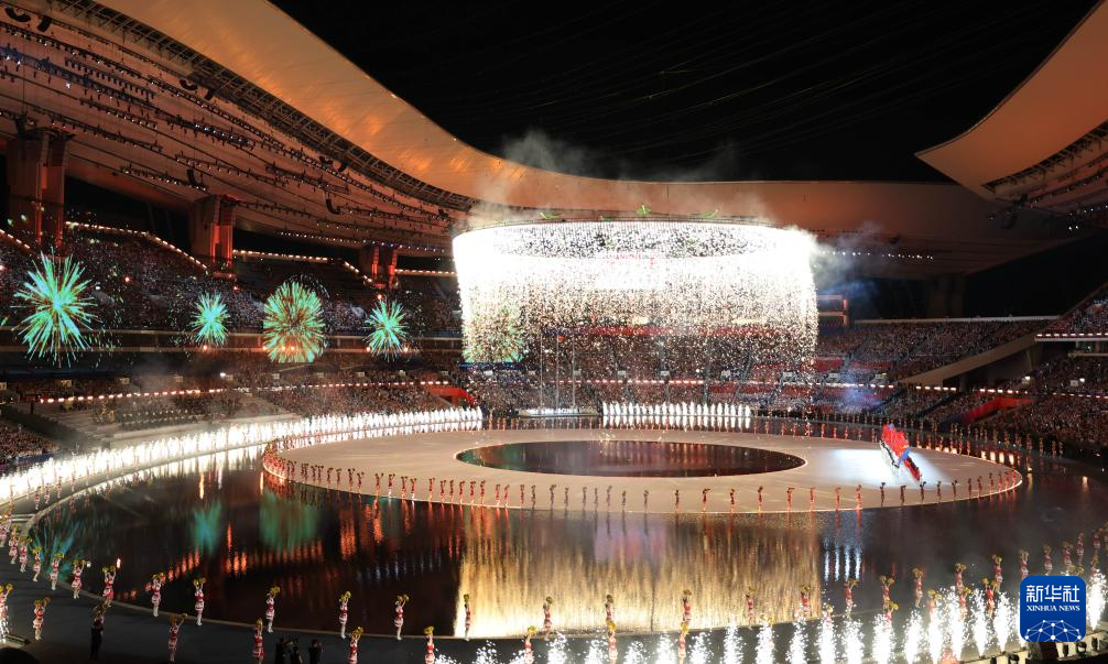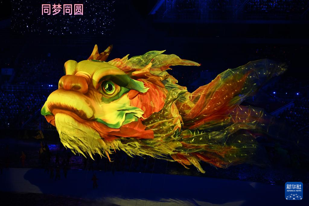 11月9日,第十五届全国运动会吉祥物“喜洋洋”和“乐融融”在开幕式现场表演。新华社记者 雒圆 摄