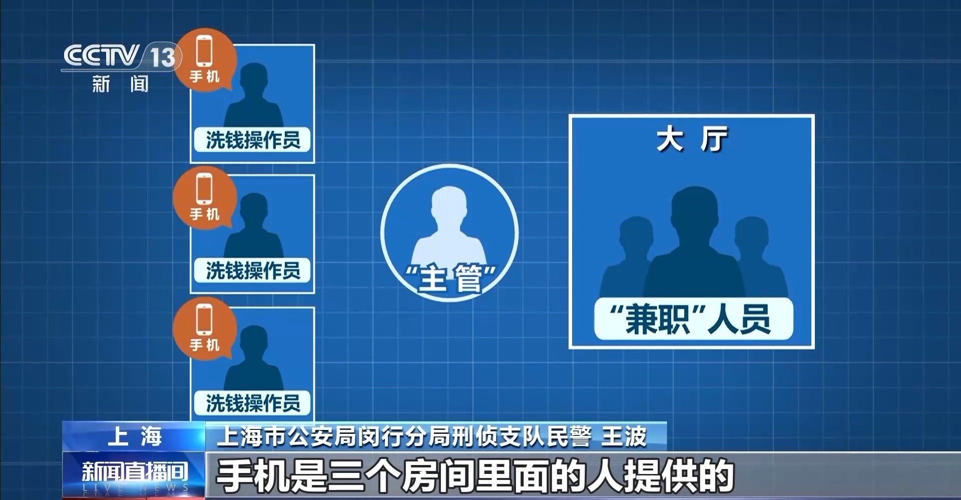 上海市公安局闵行分局刑侦支队民警 潘建树:大厅和小房间中间有一个“主管”负责对接和联络,大厅的人不可以进小房间,小房间的人也不可以和大厅的人进行聊天沟通,只有中间这个联系的人相当于主管,他才能进行两个房间之间的衔接。