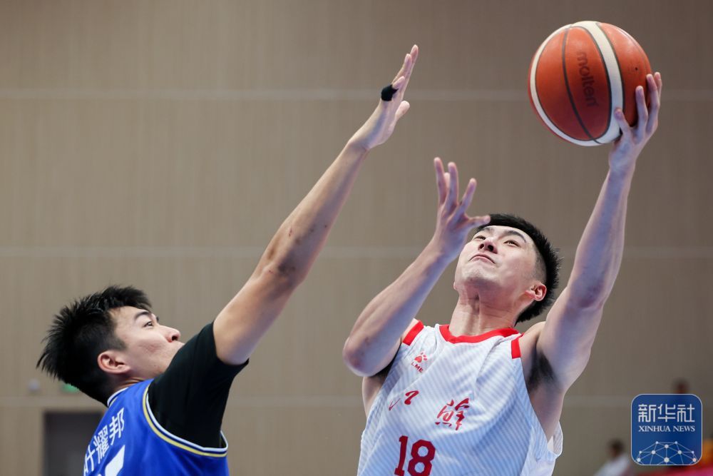 ↑ 江苏队球员蒋浩然(左)在比赛中上篮。