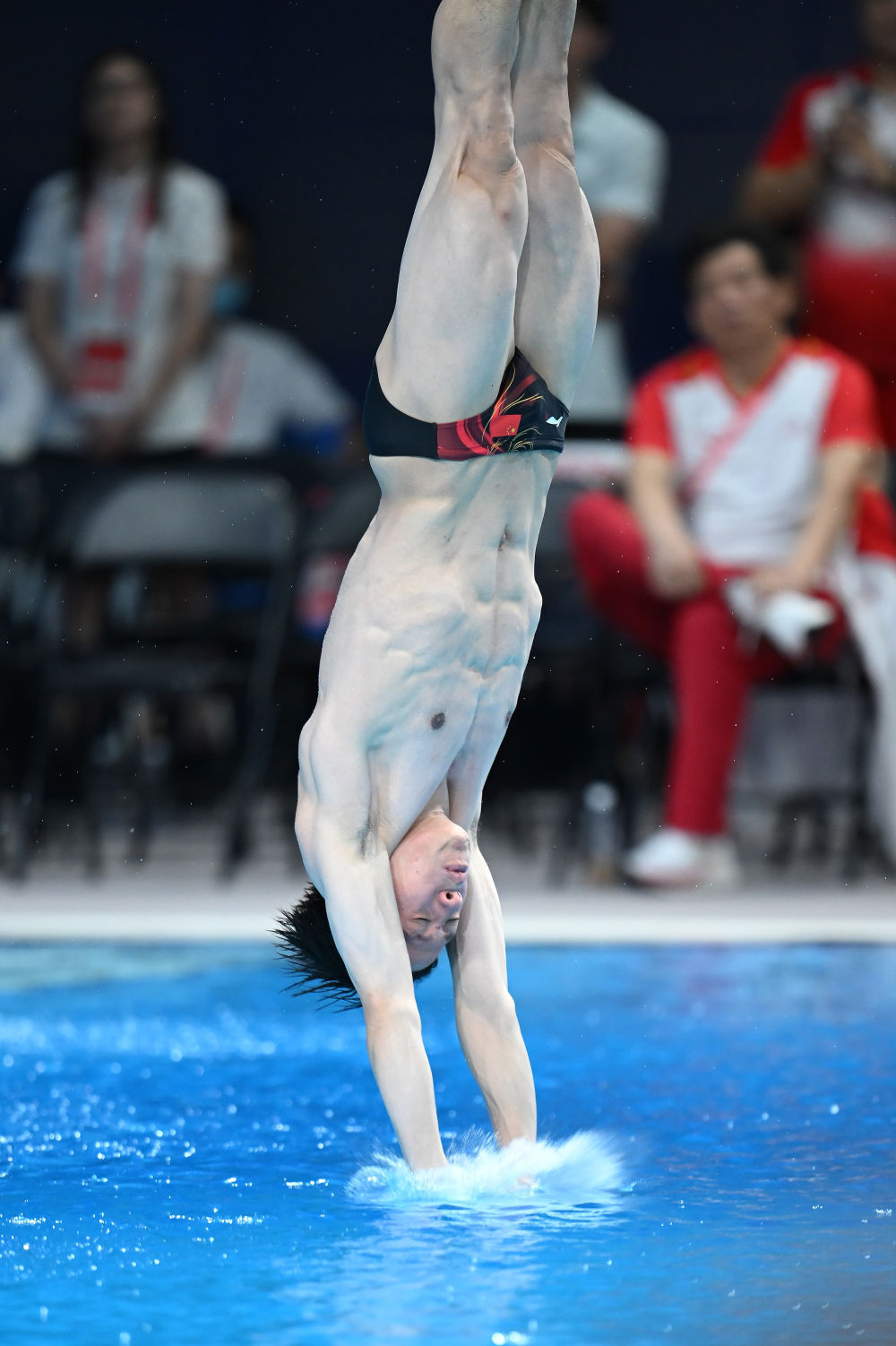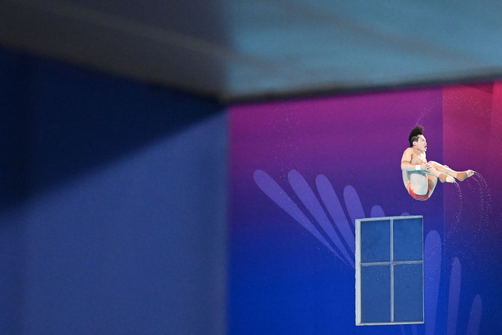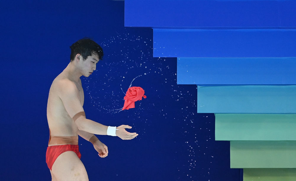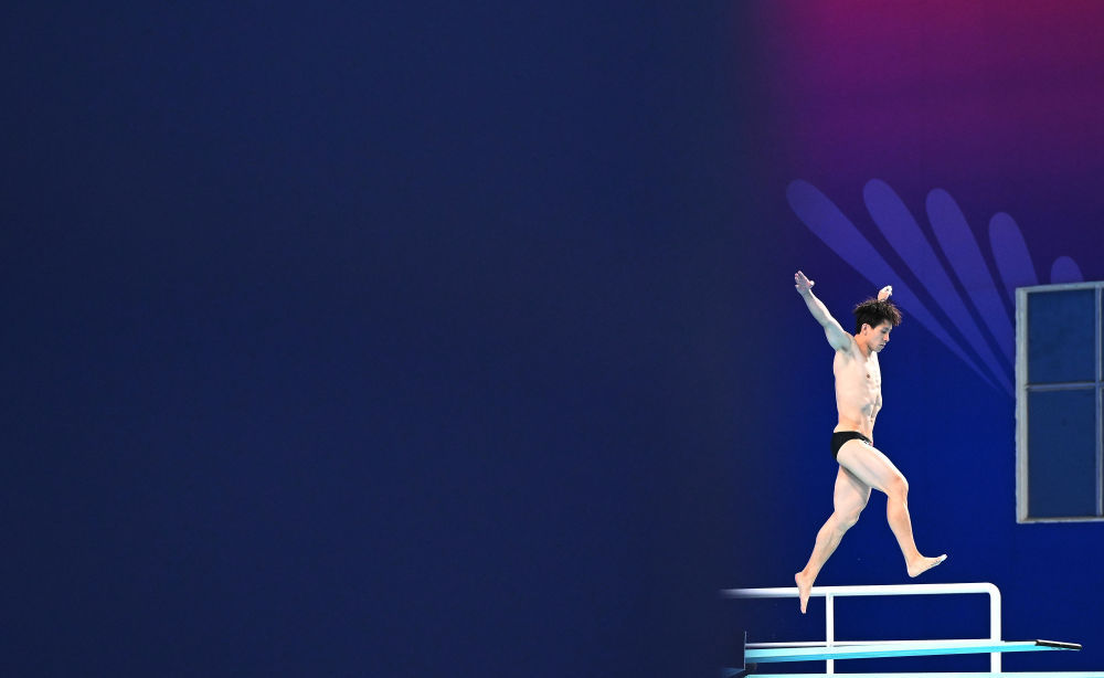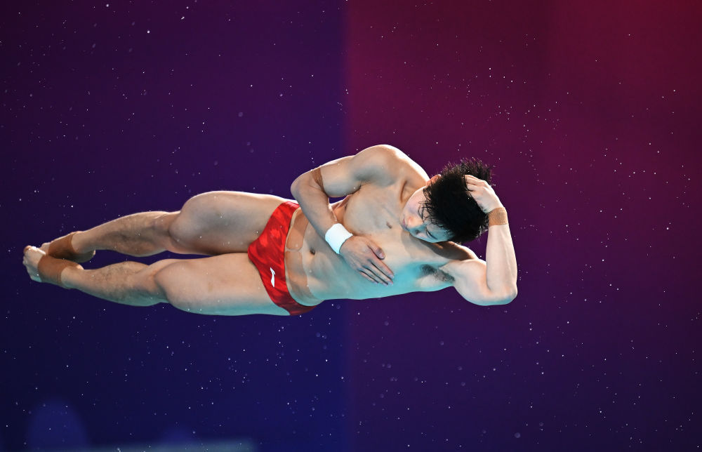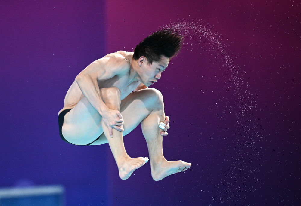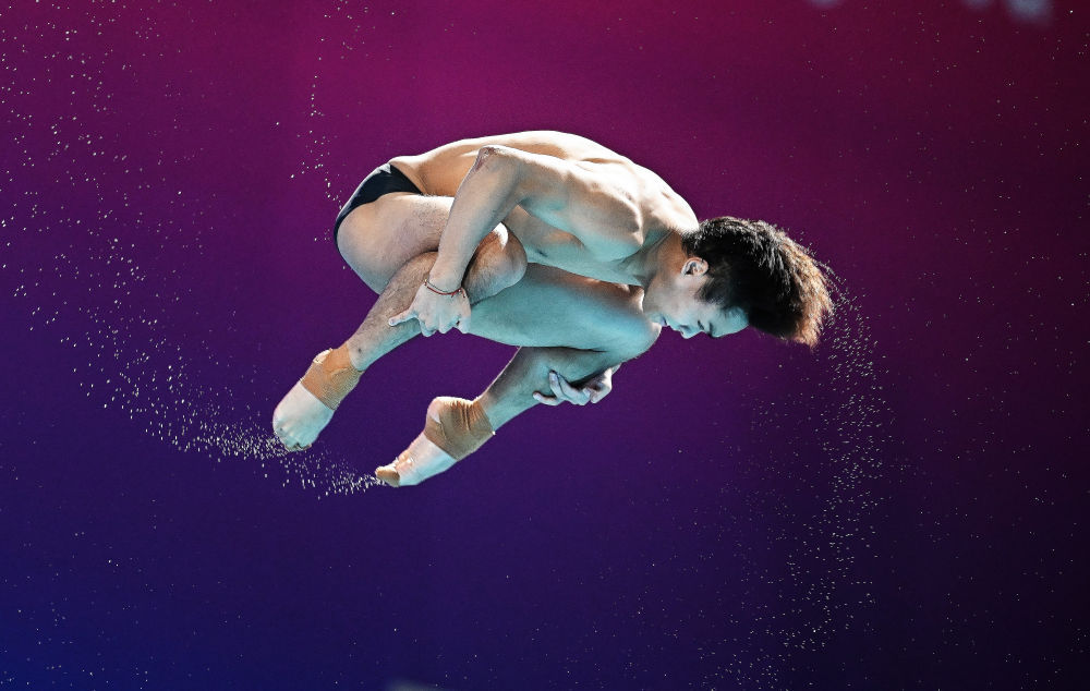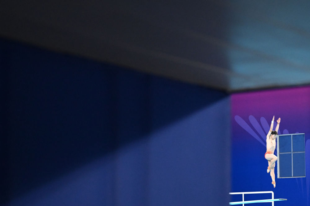 ↑ 广东队选手何超在比赛中入水。 新华社记者 肖艺九 摄