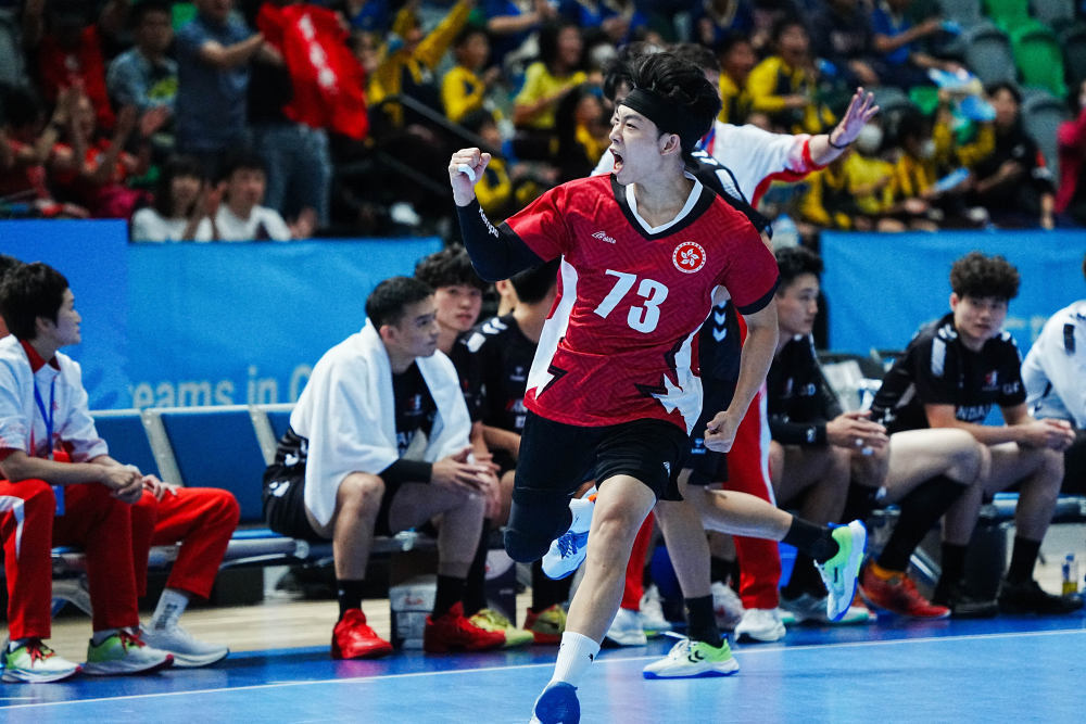 11月7日,香港队球员简翊文在比赛中庆祝得分。当日,在香港启德体艺馆进行的第十五届全国运动会男子手球四分之一决赛中,香港队28:26战胜广东队。新华社记者 朱炜 摄