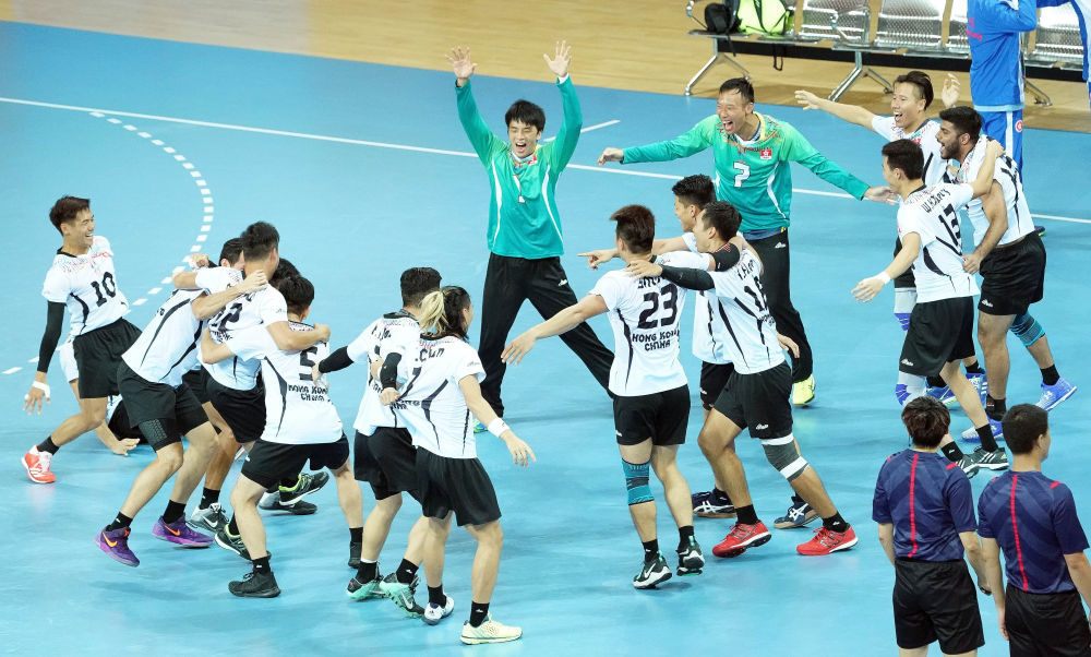 2017年8月26日,香港队球员庆祝胜利。当日,在天津进行的第十三届全运会男子手球第二阶段半决赛中,香港队以27:23战胜天津队。新华社记者 才扬 摄