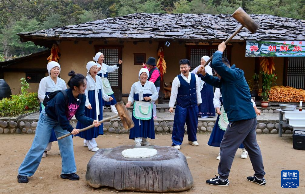 10月12日,游客(前)在辽宁省丹东市的三道河朝鲜族民俗村体验制作打糕。新华社记者 吴青昊 摄