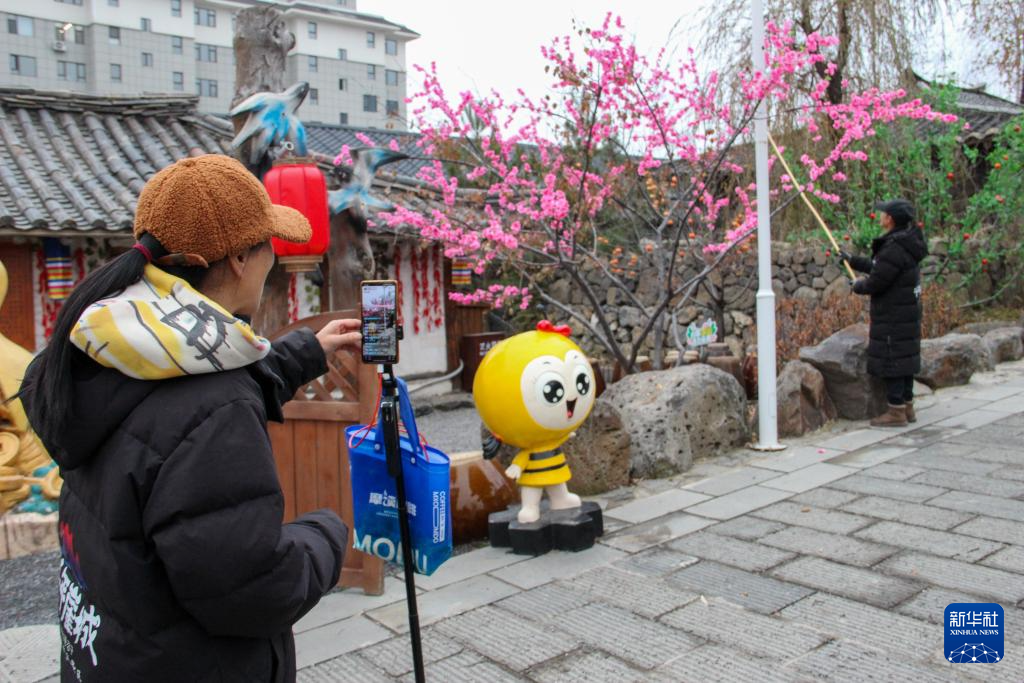 11月4日,在吉林省白山市长白朝鲜族自治县千年崖城景区,工作人员直播介绍景区特色。新华社记者 张楠 摄
