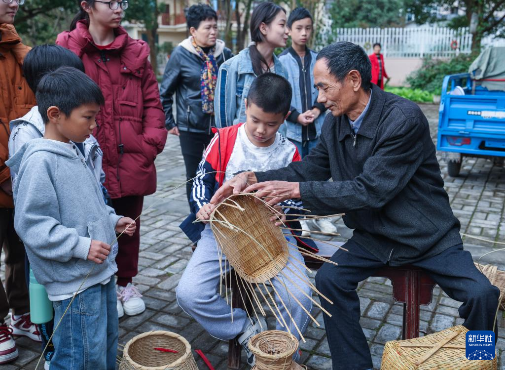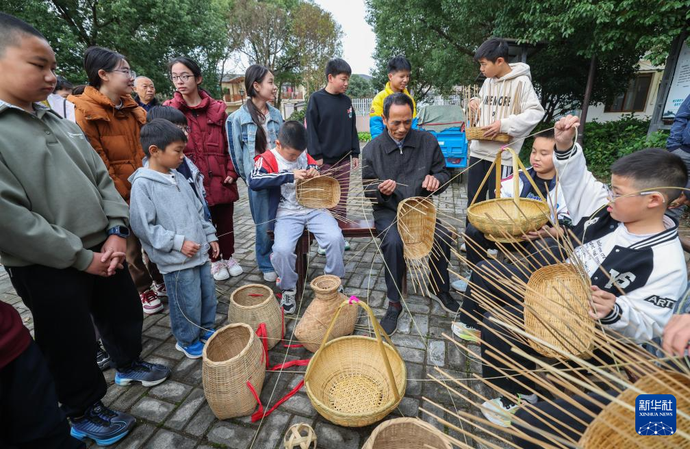 11月12日,在长兴县泗安镇罗家地村的文化广场,学生们在竹编艺人的带领下学习竹编技艺。新华社记者 徐昱 摄