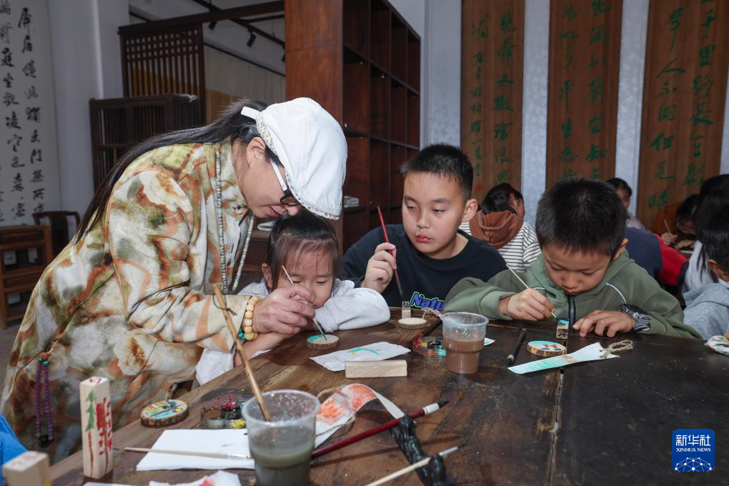 11月12日,在长兴县泗安镇罗家地村的爱心驿站里,国家一级美术师李希玲(左一)指导学生们在木条上进行绘画创作。新华社记者 徐昱 摄
