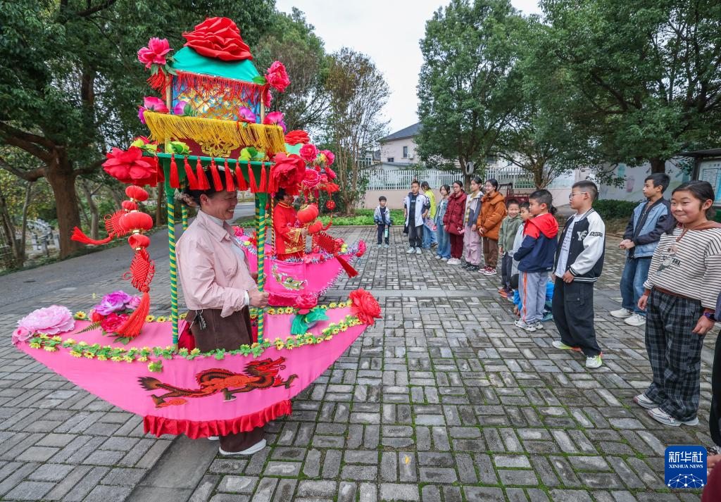 11月12日,在长兴县泗安镇罗家地村的文化广场,民间艺人给学生们示范当地传统的旱船表演。新华社记者 徐昱 摄