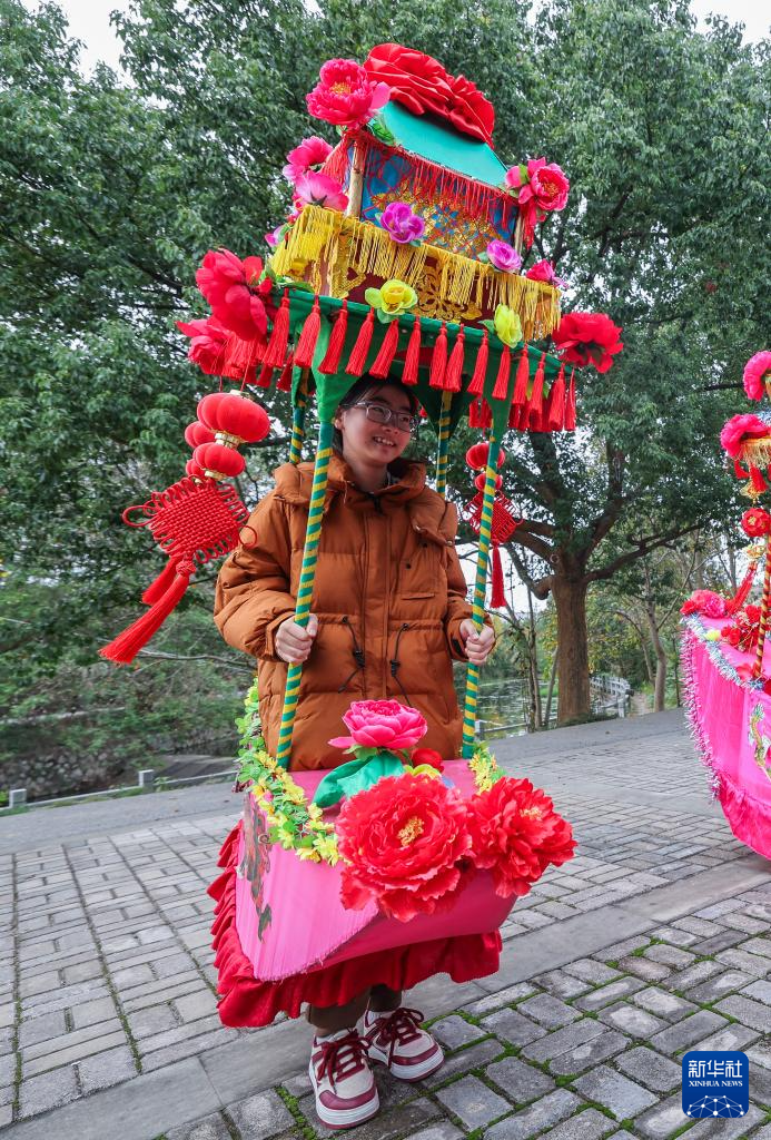 11月12日,在长兴县泗安镇罗家地村的文化广场,一名中学生在体验传统的旱船技艺。新华社记者 徐昱 摄