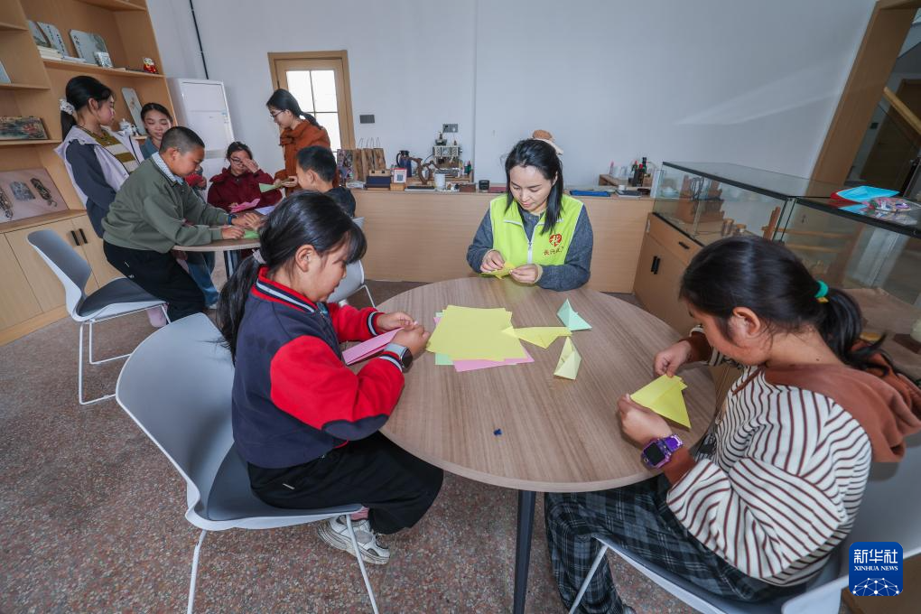 11月12日,在长兴县泗安镇罗家地村的爱心驿站里,学生们在社工的带领下参加折纸活动。新华社记者 徐昱 摄