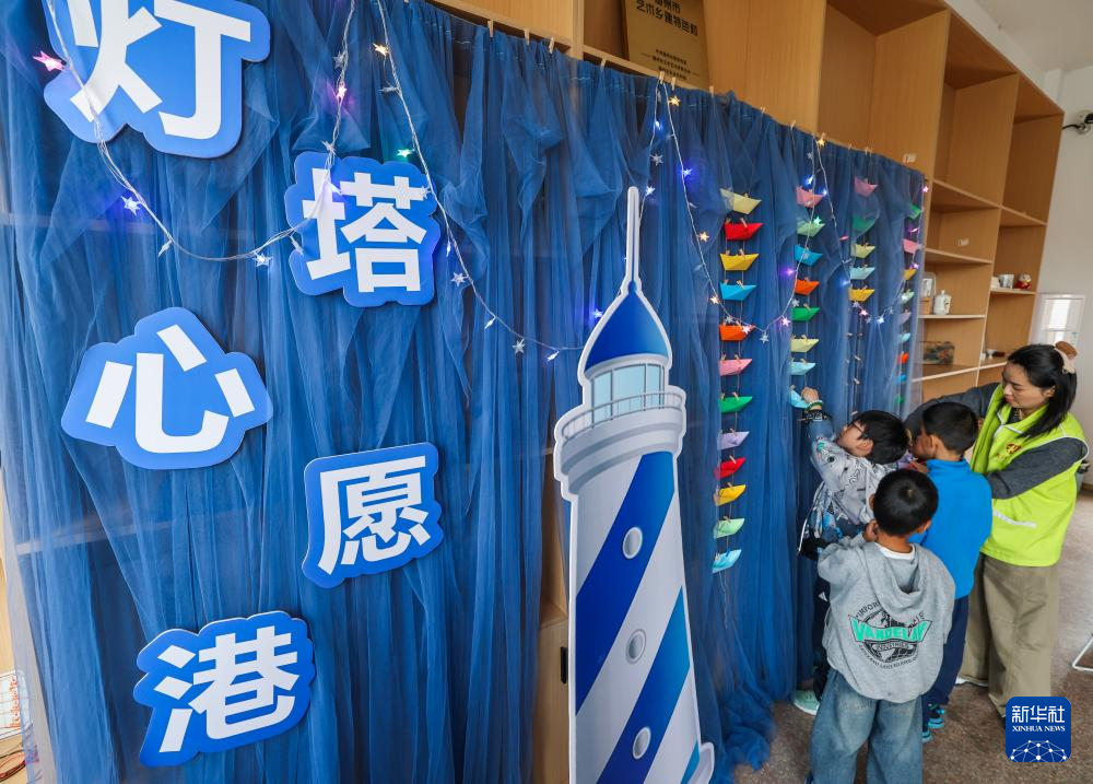 11月12日,在长兴县泗安镇罗家地村的爱心驿站里,学生们把折好的彩色纸船挂在心愿墙上。新华社记者 徐昱 摄