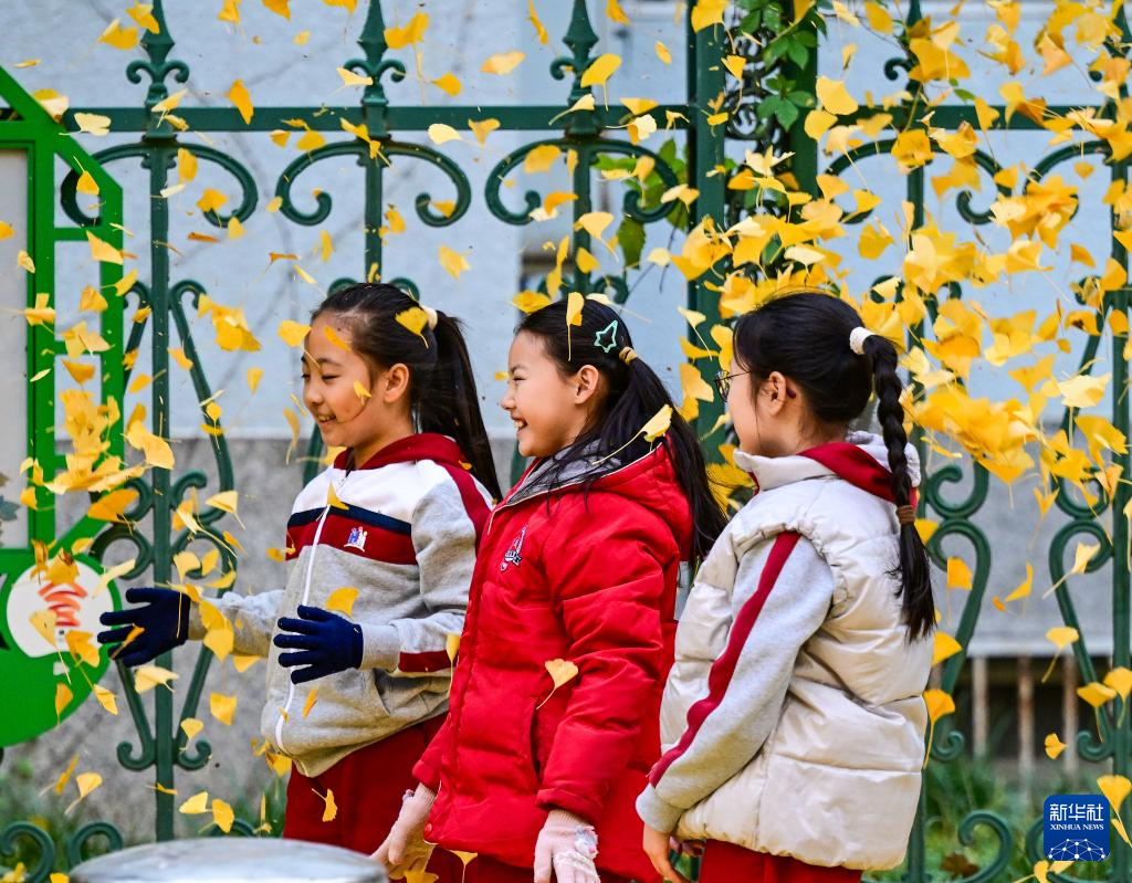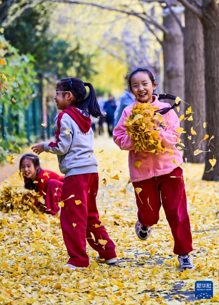 11月12日,三名小女孩在北京西城区什坊小街旁抛起银杏落叶。新华社记者 陈晔华 摄