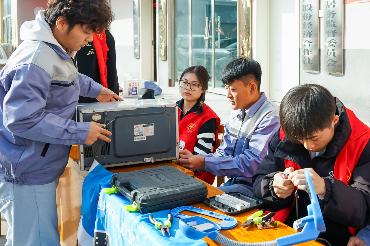 11月11日,在山东省淄博市周村区丝绸路街道赵家社区,山东轻工职业学院的志愿者正在为居民义务维修家电。