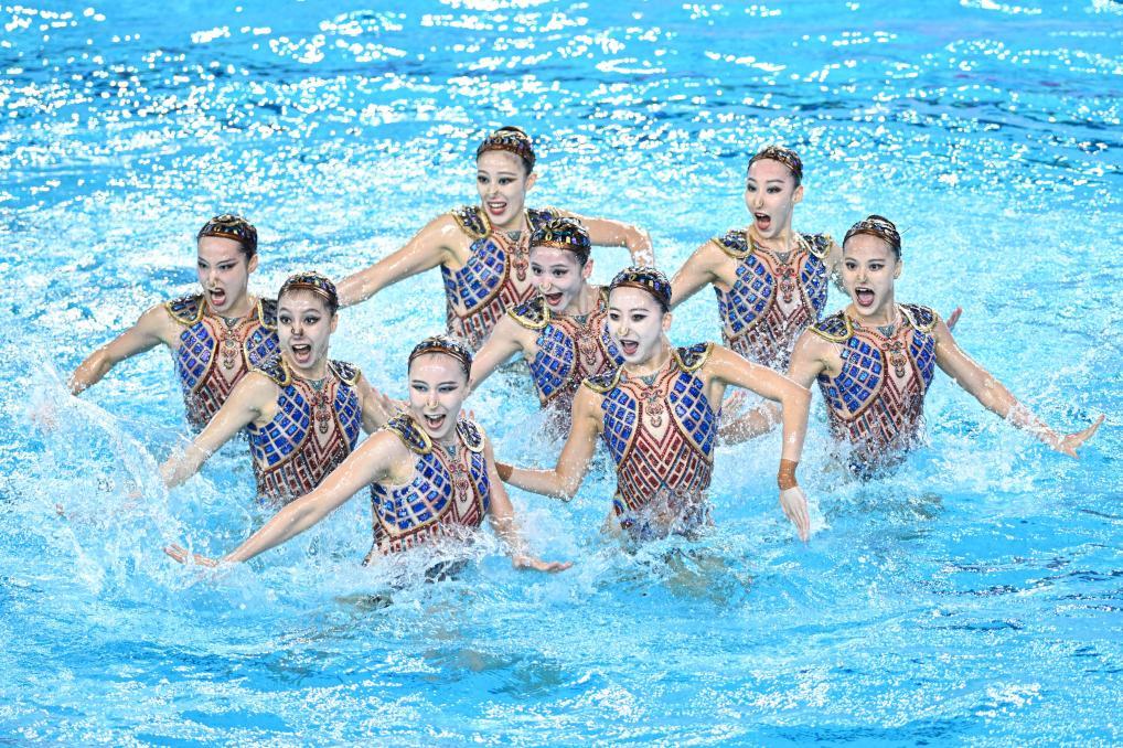 11月14日,北京体育大学队选手在花样游泳集体技巧自选比赛中。新华社记者 陈钟昊 摄