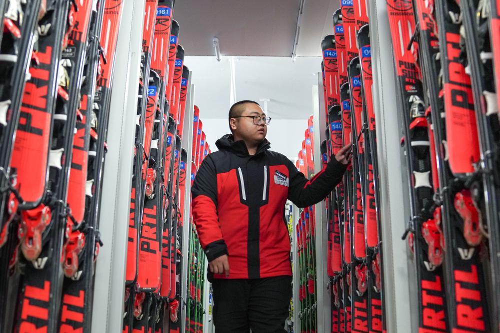 11月14日,在位于吉林市冰雪经济高质量发展试验区的北大湖滑雪度假区,工作人员清点用于租赁的雪具。新华社记者 许畅 摄