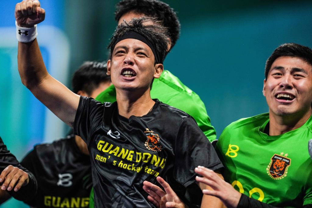 11月13日,在云浮举行的第十五届全国运动会男子曲棍球半决赛中,广东队晋级决赛。新华社记者 陶亮 摄
