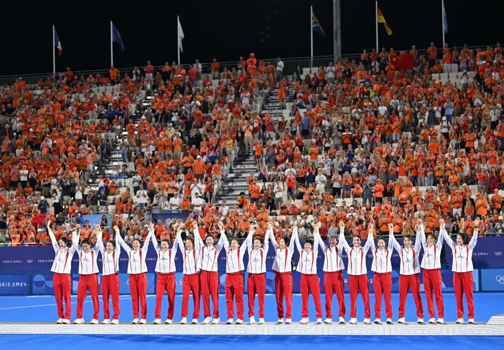 2024年8月9日,中国队获得巴黎奥运会女子曲棍球银牌。新华社记者 邬惠我 摄