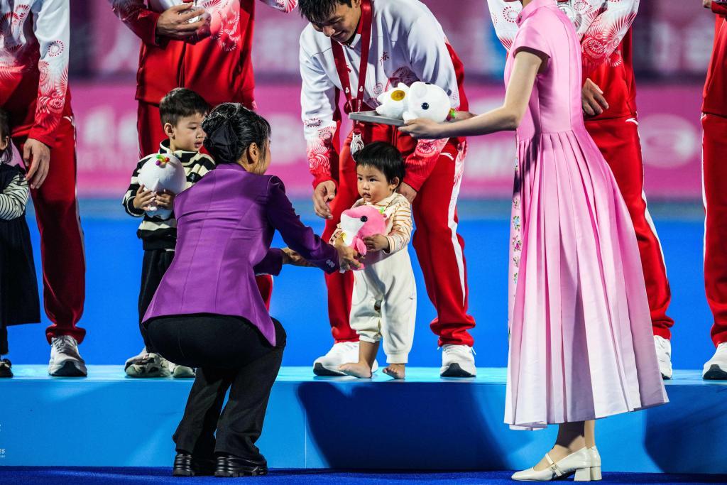 11月15日,颁奖嘉宾将吉祥物玩偶送给广东队选手的亲属。新华社记者 陶亮 摄
