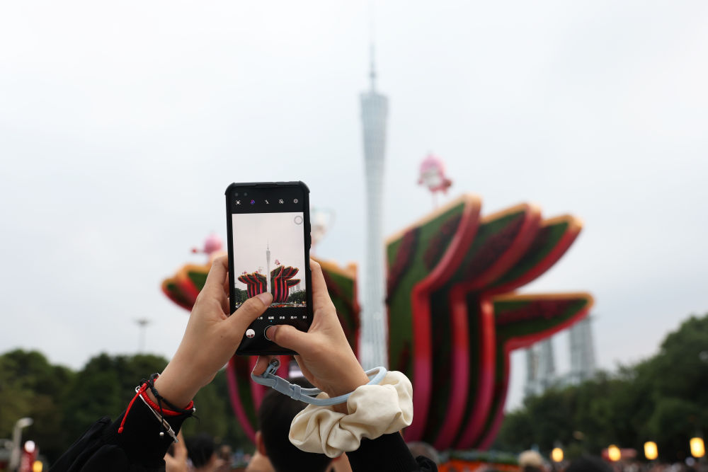 11月9日,游客在广州花城广场拍摄全运会景观和广州塔。新华社记者 王楷焱 摄