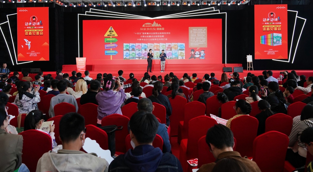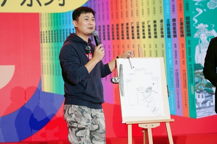 2025中国黄山书会期间,“边画边讲——跟着混知纸上游中国”——“美丽中国·从家乡出发(漫画版)”读者见面会举行。此次活动由中国少年儿童新闻出版总社(简称中少总社)、安徽新华发行集团、安徽少年儿童出版社共同主办。中少总社党委书记曾锐、总编辑张晓楠、安徽少年儿童出版社社长李玲玲等主办方领导、嘉宾及媒体记者、读者等300余人出席。活动邀请上海混知文化传播有限公司创始人、董事长陈磊为读者作了“美丽中国·从家乡出发(漫画版)”创作分享,并现场作画。