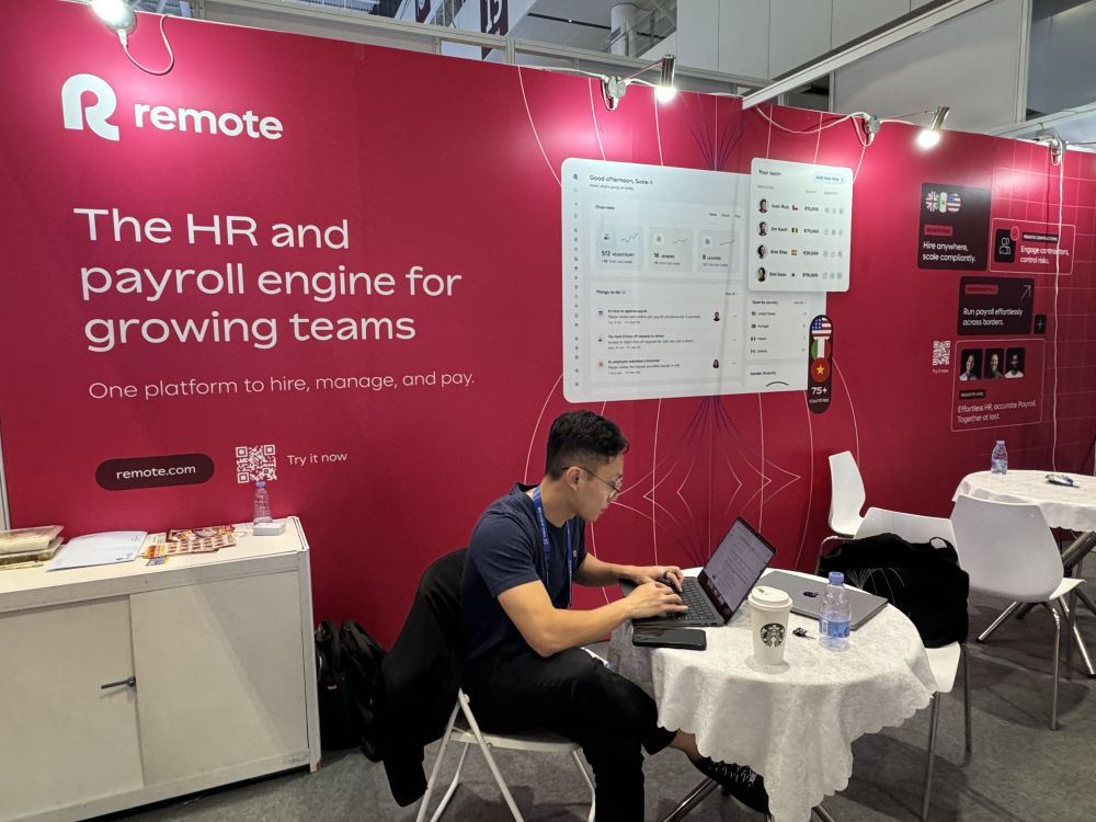 这是2025年11月14日在第二十七届中国国际高新技术成果交易会现场拍摄的美国人力资源科技企业Remote的展区。新华社记者 杨深深 摄