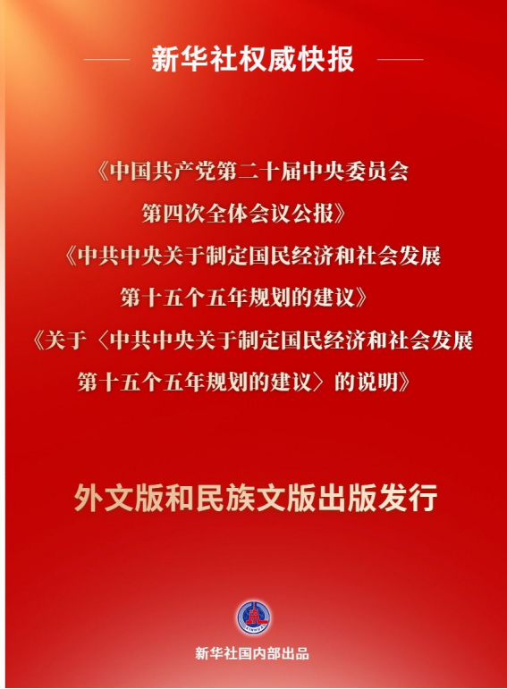《中国共产党第二十届中央委员会第四次全体会议公报》《中共中央关于制定国民经济和社会发展第十五个五年规划的建议》《关于〈中共中央关于制定国民经济和社会发展第十五个五年规划的建议〉的说明》的英文、法文、西班牙文、日文、俄文、德文、阿拉伯文、葡萄牙文、越南文、老挝文等10种外文版已由中央编译出版社、外文出版社出版,即日起向国内外公开发行。
