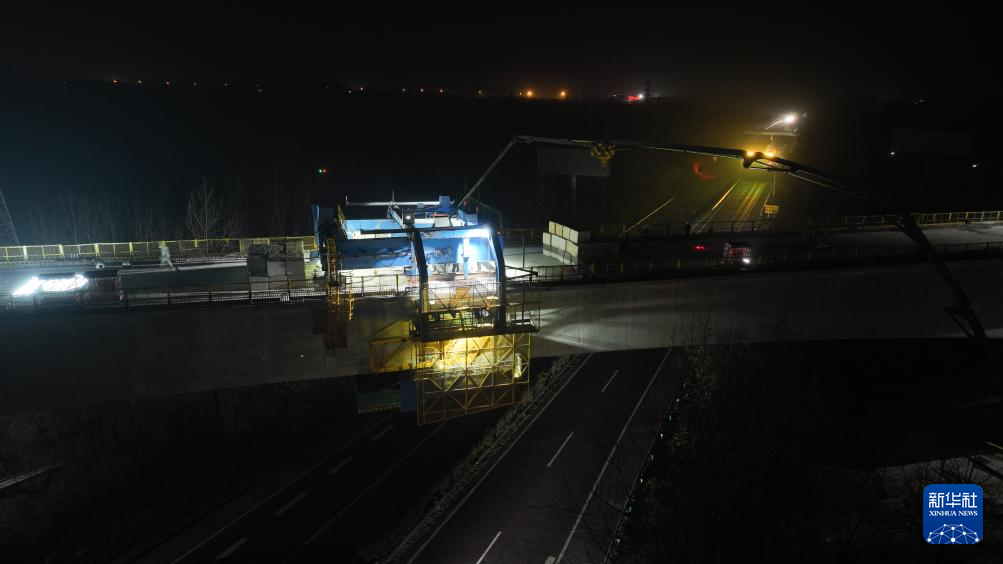 12月2日凌晨拍摄的合武高铁跨沪蓉高速特大桥合龙施工现场(无人机照片)。新华社记者 周牧 摄