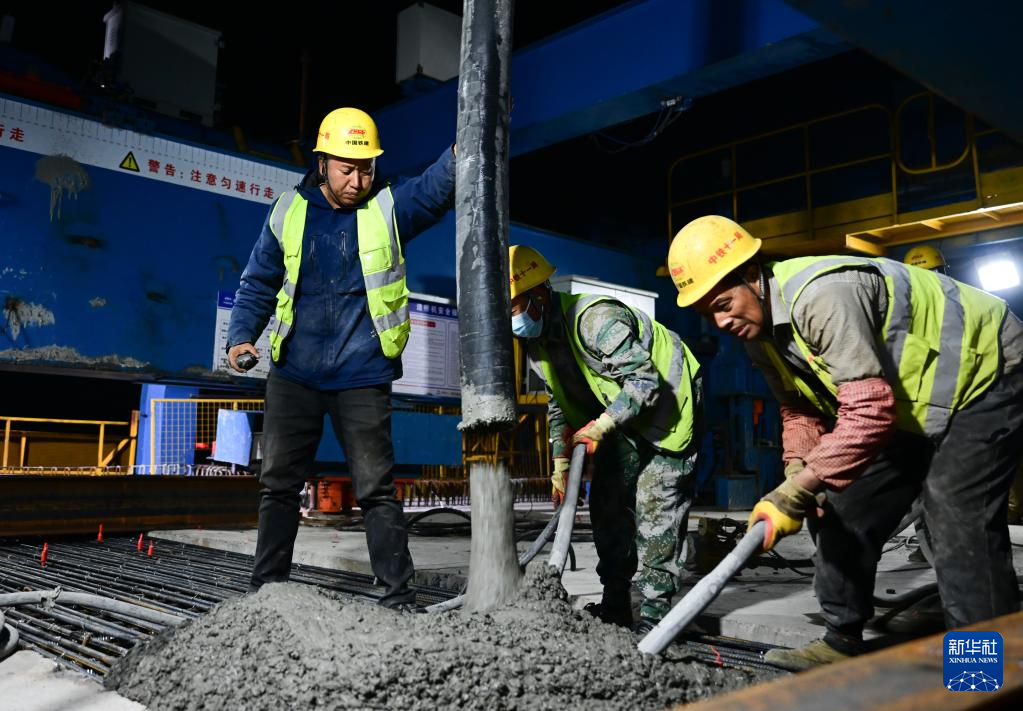 12月2日凌晨,中铁十一局工人在合武高铁跨沪蓉高速特大桥合龙施工现场作业。新华社记者 周牧 摄
