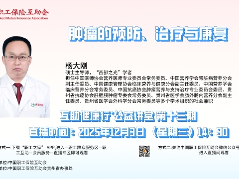直播回顾|“互助健康行·公益讲堂”2025年第十三期——肿瘤的预防、治疗与康复 2025年12月3日(周三)下午14:30至16:00,由中国职工保险互助会主办、中互会贵州省办事处承办的2025年第十三期“互助健康行·公益讲堂”——《肿瘤的预防、治疗与康复》开讲啦!为积极响应国家肿瘤防治战略,让职工朋友们真正搞懂“肿瘤怎么防”“查出肿瘤怎么办”“术后如何科学康复”,本期公益讲堂邀请贵州医科大学附属医院杨大刚主任为广大职工朋友们讲解《肿瘤的预防、治疗与康复》这一课题。带您跳出肿瘤防治的认知陷阱,掌握从预防筛查到治疗康复的全流程科学方法,为自己和家人筑牢健康防线!中工网首页、微博、视频号同步播出。