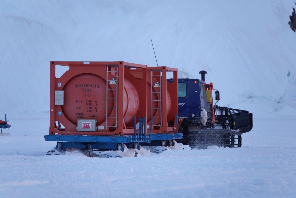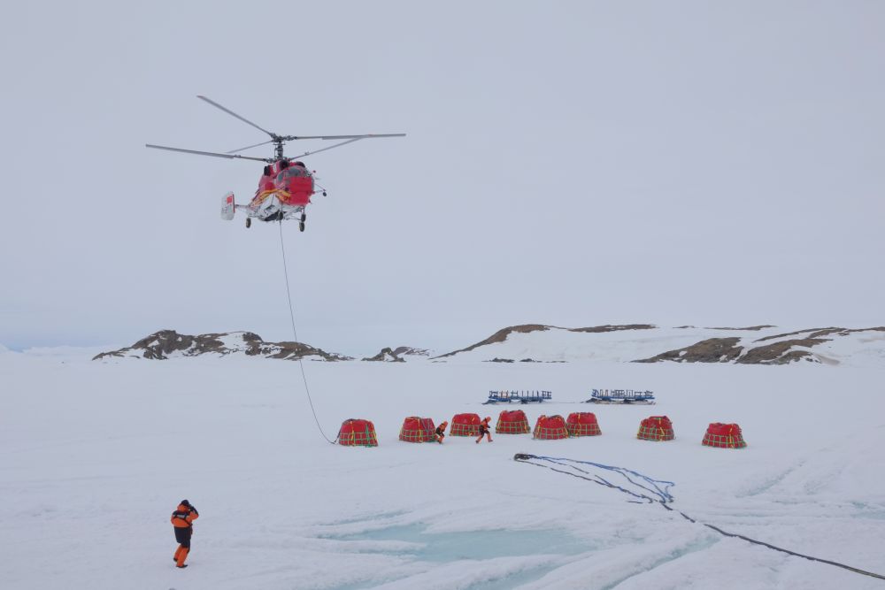据悉,“雪龙2”号正采取“白天空吊、夜晚冰运”的节奏开展物资和燃油卸运,白天利用直升机吊挂油囊,夜间趁低温海冰承载力较好时开展冰面车辆雪橇运输。