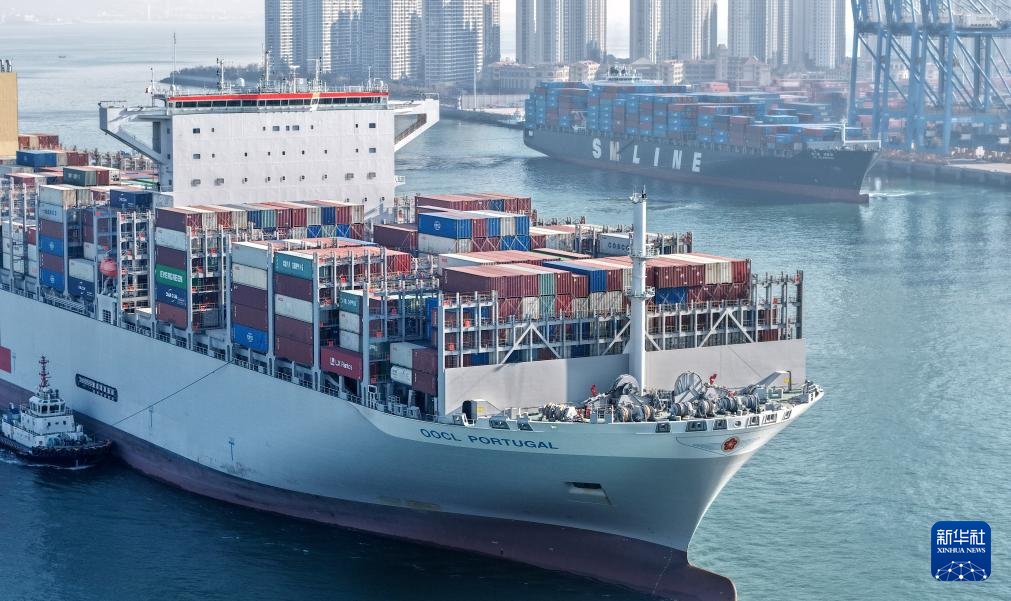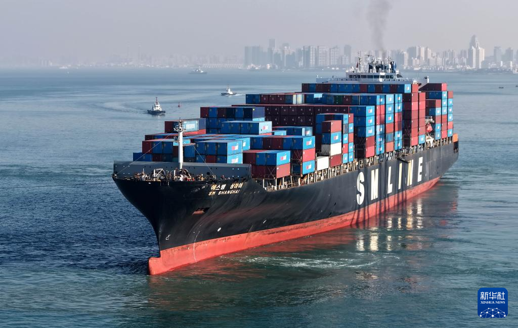12月4日,一艘满载集装箱的货轮驶离青岛港前湾港区码头(无人机照片)。新华社记者 李紫恒 摄