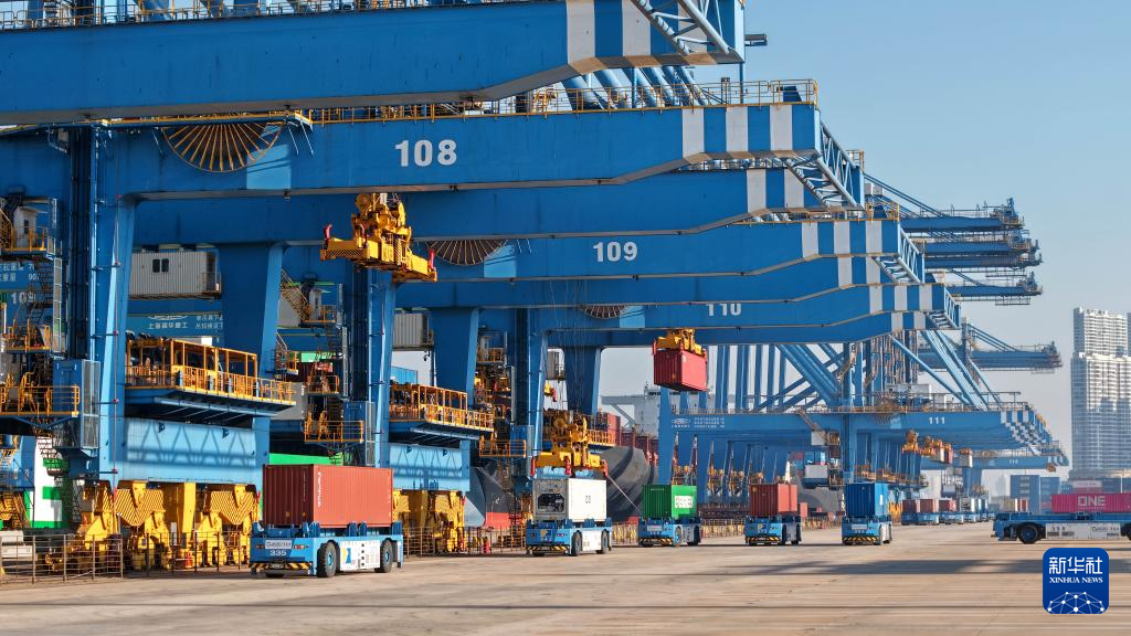 12月4日,货轮在青岛港前湾港区码头装卸集装箱(无人机照片)。新华社记者 李紫恒 摄