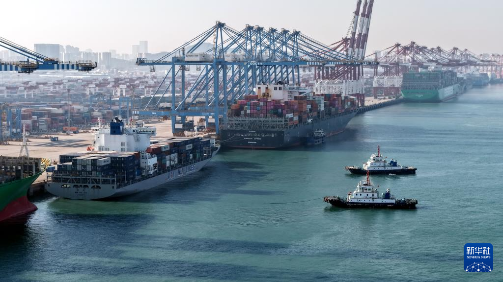 12月4日,货轮进出青岛港前湾港区(无人机照片)。新华社记者 李紫恒 摄