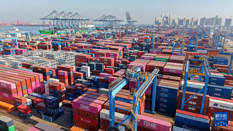 12月4日在青岛港前湾港区拍摄的等待转运的集装箱(无人机照片)。新华社记者 李紫恒 摄