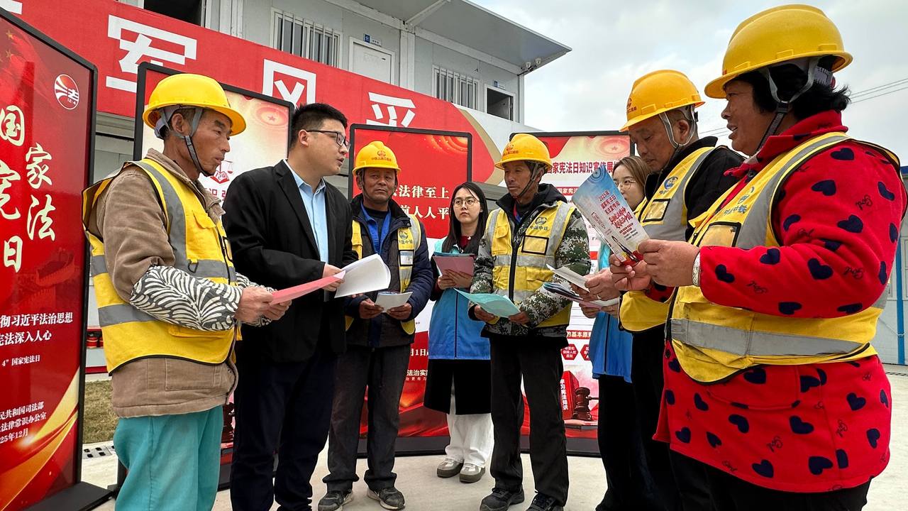 中铁上海局三公司“开路先锋”青年志愿者在活动现场发放普法宣传手册、口袋书、维权联系卡等资料,方便农民工随时查阅学习、快速对接法律援助渠道,真正将法治保障送到农民工身边。