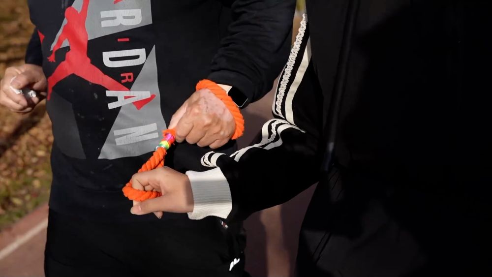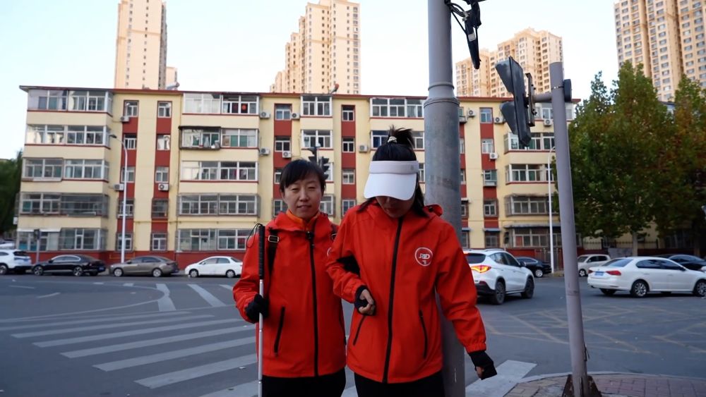 志愿者和盲友的手用一根橘色的绳子连接,这是彼此信任的纽带。
