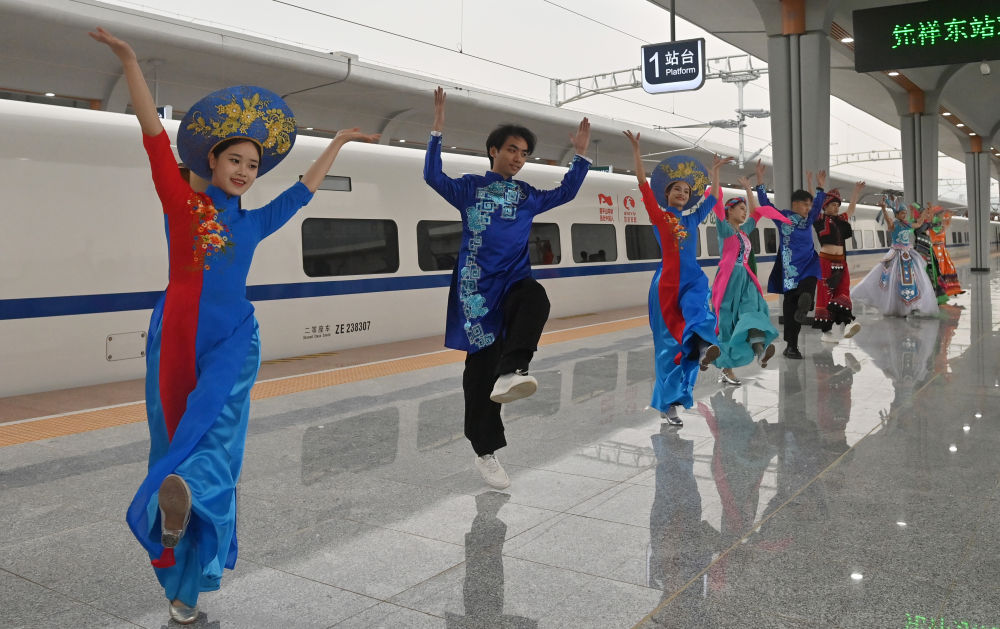 12月5日,人们在凭祥东站载歌载舞欢庆南凭高铁全线贯通。新华社记者 陆波岸 摄