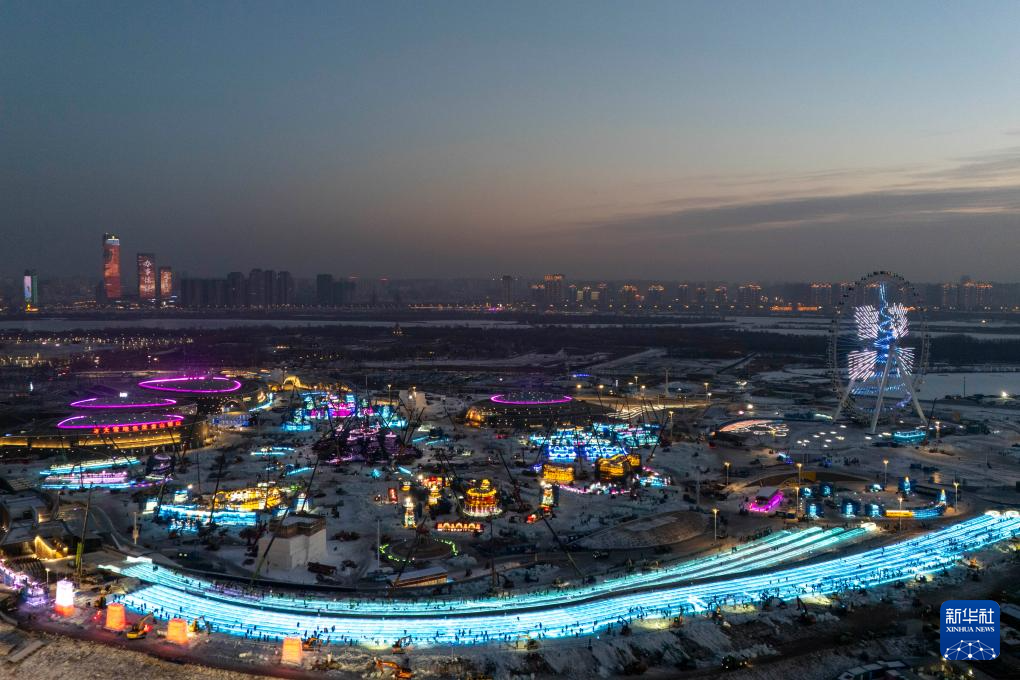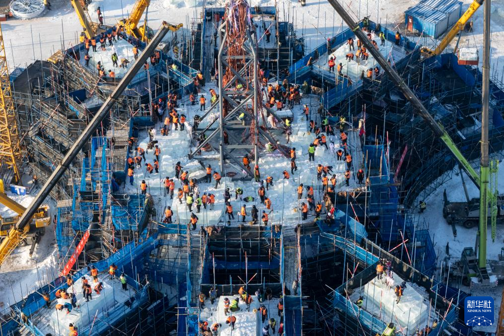 12月5日,在哈尔滨冰雪大世界施工现场,工人在进行冰建作业(无人机照片)。新华社记者 张涛 摄